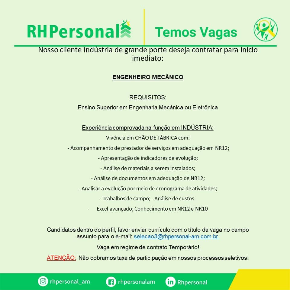ATENÇÃO: Nunca pague nenhum valor para participar de um processo seletivo. Não compre cursos, apostilas ou serviços que prometam participação em seleção ou contratação para… Read More »Estamos recebendo currículo para diversas áreas: