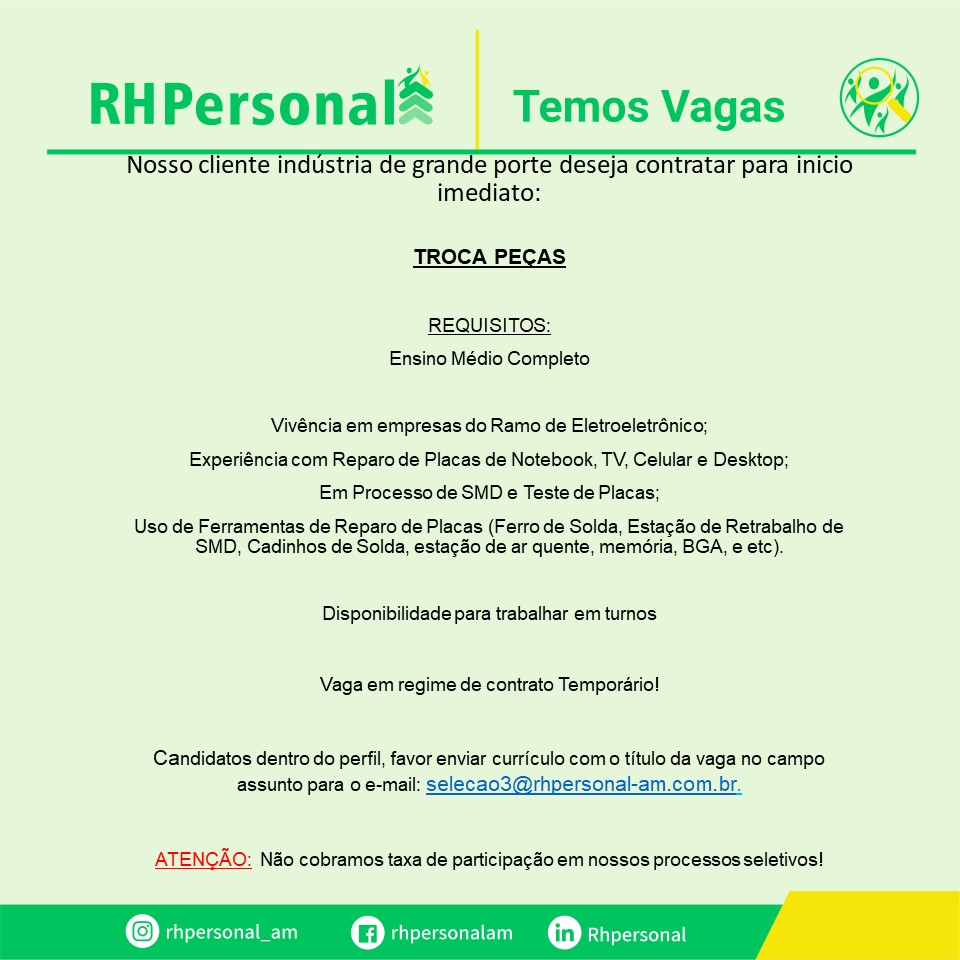 ATENÇÃO: Nunca pague nenhum valor para participar de um processo seletivo. Não compre cursos, apostilas ou serviços que prometam participação em seleção ou contratação para… Read More »RH PERSONAL ESTÁ RECRUTANDO NOVOS PROFISSIONAIS: