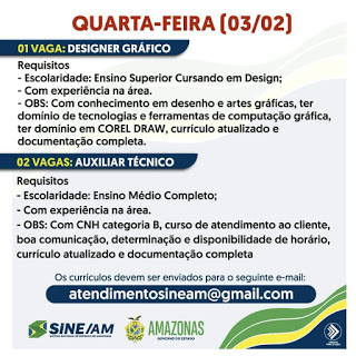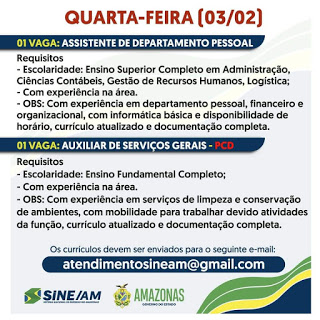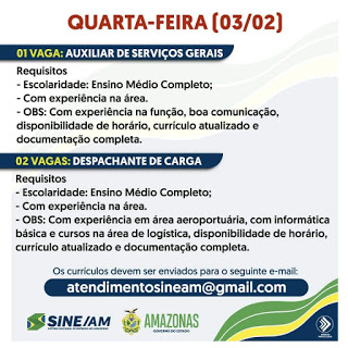 As oportunidades de emprego são de diversas empresas e instituições do Amazonas e os detalhes das vagas serão informados pelos empregadores.