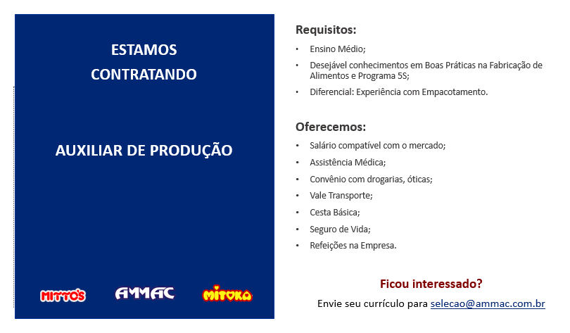 AUXILIAR DE PRODUÇÃO • Salário compatível com o mercado; Assistência Médica; Convênio com drogarias, óticas; Vale Transporte; Cesta Básica; Seguro de Vida; Refeições na Empresa. Ficou interessado? AMMAC miroKa Envie seu currículo para: [email protected]