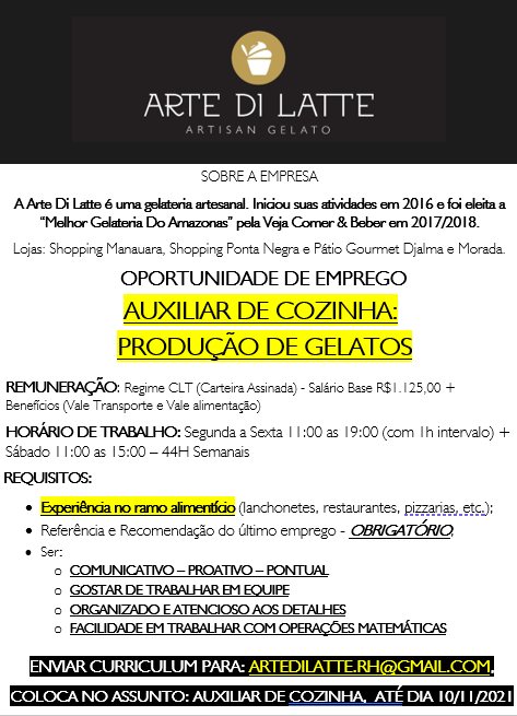 REMUNERAÇÃO: Regime CLT (Carteira Assinada) – Salário Base R$1.125,00 + Beneficios (Vale Transporte e Vale alimentação) HORÁRIO DE TRABALHO: Segunda a Sexta I1:00 as 19:00 (com Ih intervalo) + Sábado I1:00 as 15:00 – 44H Semanais REQUISITOS: • Experiência no ramo alimentício (lanchonetes, restaurantes, pizzarias, etc.); • Referência e Recomendação do último emprego – OBRIGATÓRIO, • Ser: o COMUNICATIVO- PROATIVO – PONTUAL O GOSTAR DE TRABALHAR EM EQUIPE O ORGANIZADO E ATENCIOSO AOS DETALHES o FACILIDADE EM TRABALHAR COM OPERAÇÕES MATEMÁTICAS ENVIAR CURRICULUM PARA: [email protected]. COLOCA NO ASSUNTO: AUXILIAR DE COZINHA.