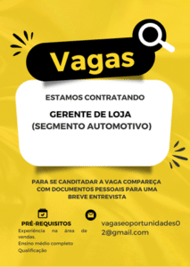 As vagas anunciadas e disponibilizadas neste site são repassadas por responsabilidade da empresa ou representante do RH. Não possuímos quaisquer vínculos com a empresa ou o anunciante. Temos o único objetivo de repassar para a população o benefício de visitar gratuitamente o nosso site, com o intuito de alcançarem o tão sonhado emprego.