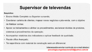 As vagas anunciadas e disponibilizadas neste site são repassadas por responsabilidade da empresa ou representante do RH. Não possuímos quaisquer vínculos com a empresa ou o anunciante. Temos o único objetivo de repassar para a população o benefício de visitar gratuitamente o nosso site, com o intuito de alcançarem o tão sonhado emprego.