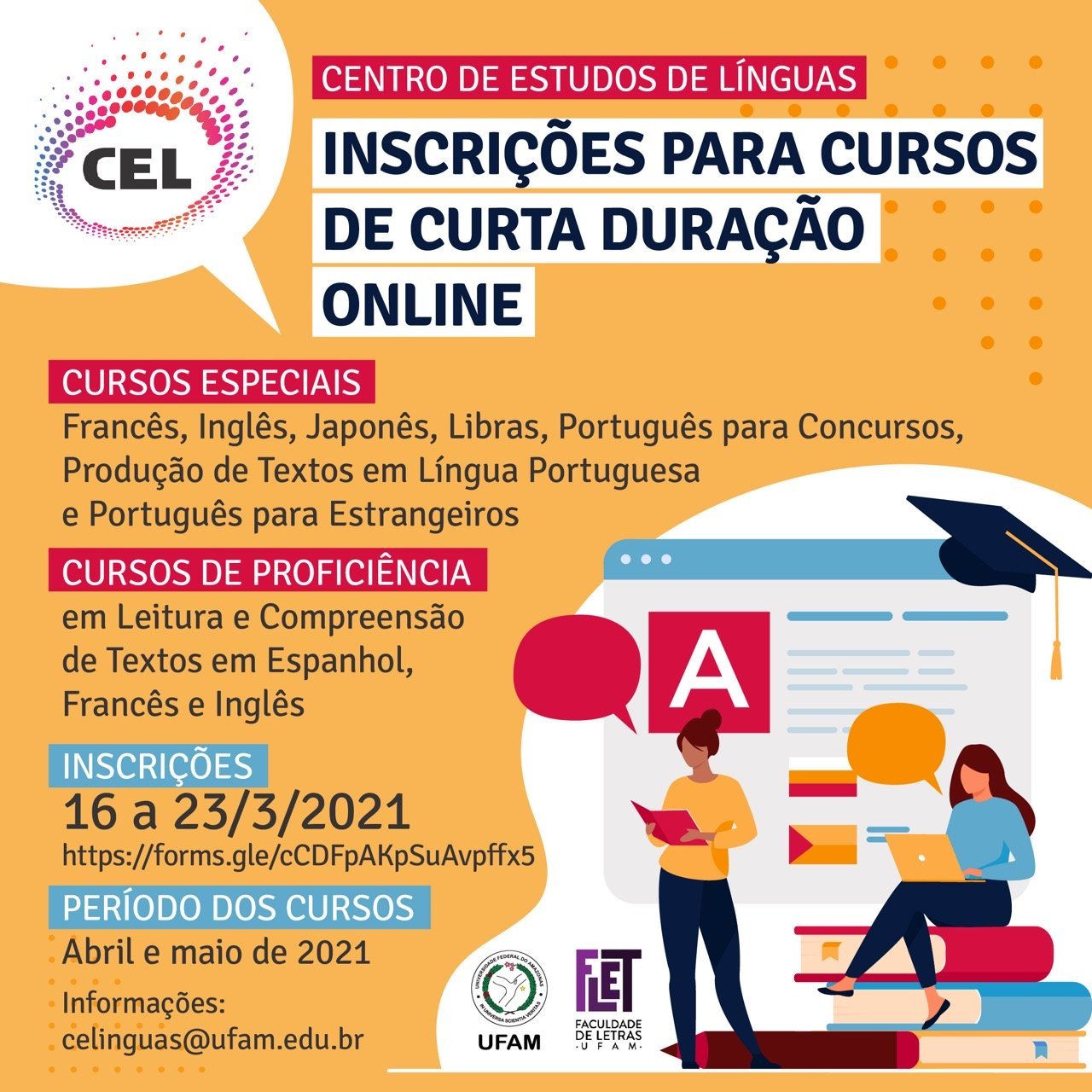 O Centro de Estudos de Línguas da Universidade Federal do Amazonas (CEL/Ufam) está com inscrições abertas, entre 8h do dia 16 de março até as 23h59 do dia 23 de março (horário de Manaus), para cursos online especiais de curta duração. Os cursos serão realizados no período de abril e maio de 2021, em ambiente virtual, com aulas síncronas e estudo assíncrono, pelo Google Meet. Os interessados podem acessar o formulário de inscrição AQUI e o Edital completo AQUI.