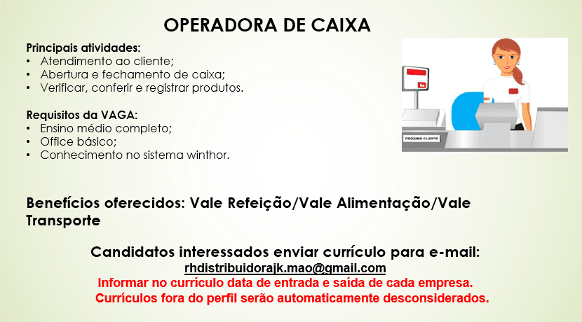 As vagas anunciadas e disponibilizadas neste site são repassadas por responsabilidade da empresa ou representante do RH. Não possuímos quaisquer vínculos com a empresa ou o anunciante. Temos o único objetivo de repassar para a população o benefício de visitar gratuitamente o nosso site, com o intuito de alcançarem o tão sonhado emprego.