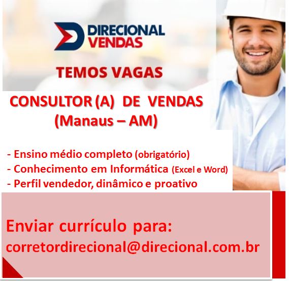 (Manaus – AM) – Ensino médio completo (obrigatório) – Conhecimento em Informática (Excel e Word) – Perfil vendedor, dinâmico e proativo Enviar currículo para: [email protected]