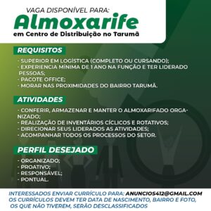 As vagas anunciadas e disponibilizadas neste site são repassadas por responsabilidade da empresa ou representante do RH. Não possuímos quaisquer vínculos com a empresa ou o anunciante. Temos o único objetivo de repassar para a população o benefício de visitar gratuitamente o nosso site, com o intuito de alcançarem o tão sonhado emprego.