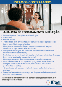 As vagas anunciadas e disponibilizadas neste site são repassadas por responsabilidade da empresa ou representante do RH. Não possuímos quaisquer vínculos com a empresa ou o anunciante. Temos o único objetivo de repassar para a população o benefício de visitar gratuitamente o nosso site, com o intuito de alcançarem o tão sonhado emprego.