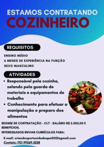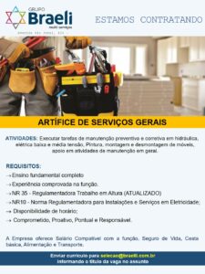 As vagas anunciadas e disponibilizadas neste site são repassadas por responsabilidade da empresa ou representante do RH. Não possuímos quaisquer vínculos com a empresa ou o anunciante. Temos o único objetivo de repassar para a população o benefício de visitar gratuitamente o nosso site, com o intuito de alcançarem o tão sonhado emprego.