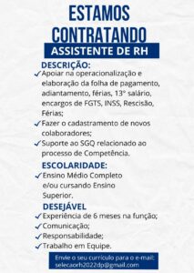 As vagas anunciadas e disponibilizadas neste site são repassadas por responsabilidade da empresa ou representante do RH. Não possuímos quaisquer vínculos com a empresa ou o anunciante. Temos o único objetivo de repassar para a população o benefício de visitar gratuitamente o nosso site, com o intuito de alcançarem o tão sonhado emprego.