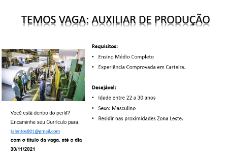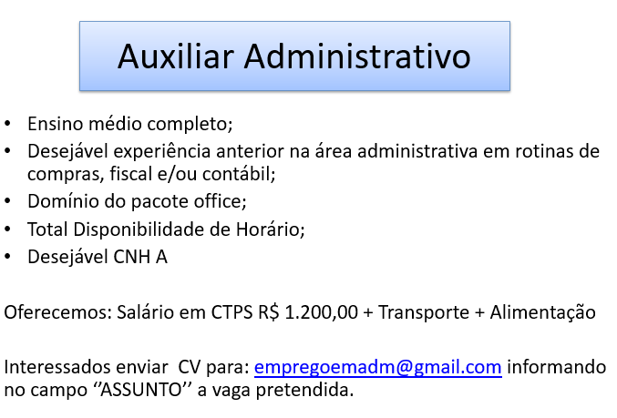 As vagas anunciadas e disponibilizadas neste site são repassadas por responsabilidade da empresa ou representante do RH. Não possuímos quaisquer vínculos com a empresa ou o anunciante. Temos o único objetivo de repassar para a população o benefício de visitar gratuitamente o nosso site, com o intuito de alcançarem o tão sonhado emprego.