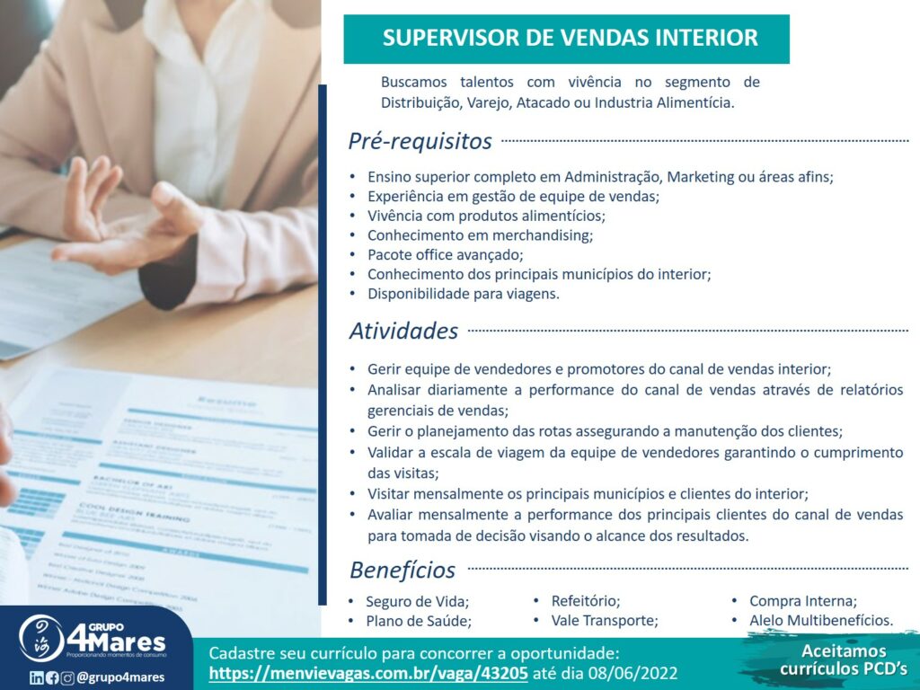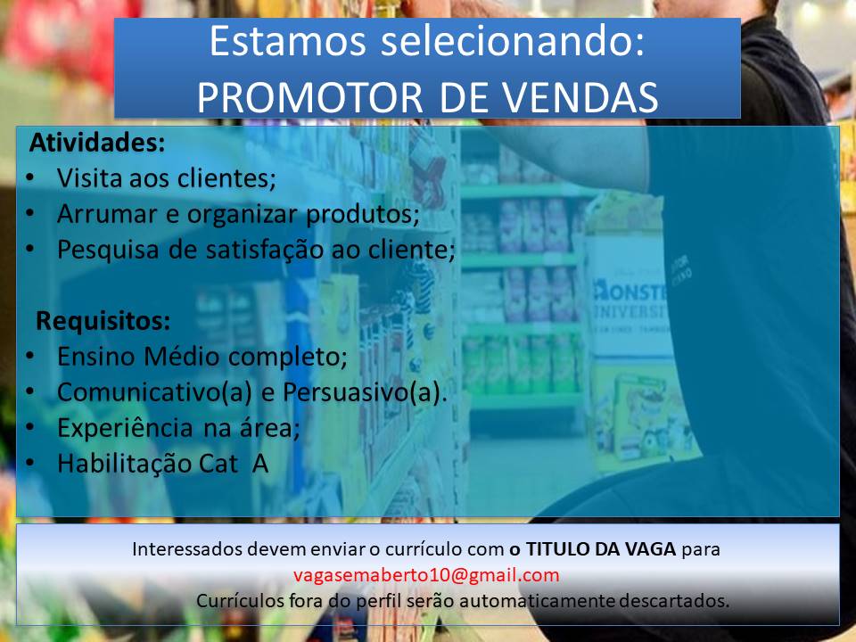 As vagas anunciadas e disponibilizadas neste site são repassadas por responsabilidade da empresa ou representante do RH. Não possuímos quaisquer vínculos com a empresa ou o anunciante. Temos o único objetivo de repassar para a população o benefício de visitar gratuitamente o nosso site, com o intuito de alcançarem o tão sonhado emprego.