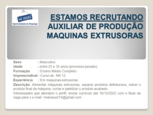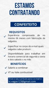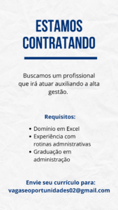 As vagas anunciadas e disponibilizadas neste site são repassadas por responsabilidade da empresa ou representante do RH. Não possuímos quaisquer vínculos com a empresa ou o anunciante. Temos o único objetivo de repassar para a população o benefício de visitar gratuitamente o nosso site, com o intuito de alcançarem o tão sonhado emprego.