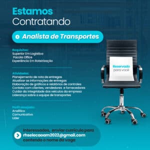 As vagas anunciadas e disponibilizadas neste site são repassadas por responsabilidade da empresa ou representante do RH. Não possuímos quaisquer vínculos com a empresa ou o anunciante. Temos o único objetivo de repassar para a população o benefício de visitar gratuitamente o nosso site, com o intuito de alcançarem o tão sonhado emprego.