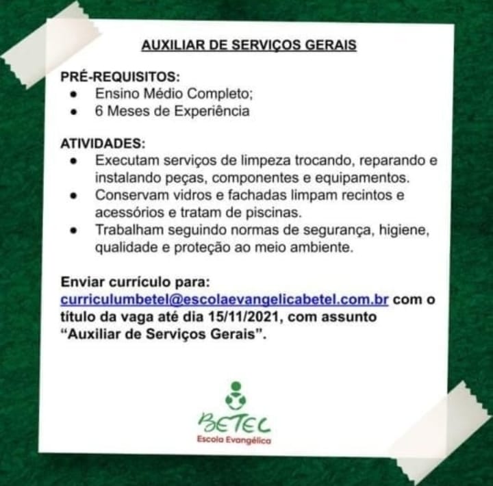 PRÉ-REQUISITOS: Ensino Médio Completo; • 6 Meses de Experiência ATIVIDADES: Executam serviços de limpeza trocando, reparando e instalando peças, componentes e equipamentos. Conservam vidros e fachadas limpam recintos e acessórios e tratam de piscinas. • Trabalham seguindo normas de segurança, higiene, qualidade e proteção ao meio ambiente. Enviar curriculo para: [email protected] com o título da vaga até dia 15/11/2021, com assunto “Auxiliar de Serviços Gerais”.