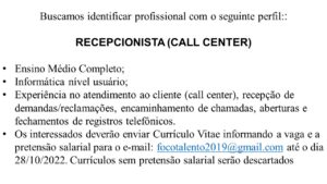 Estamos contratando para as seguintes funções: – Emprego Day – AM