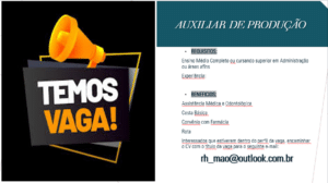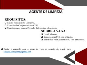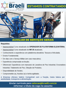 As vagas anunciadas e disponibilizadas neste site são repassadas por responsabilidade da empresa ou representante do RH. Não possuímos quaisquer vínculos com a empresa ou o anunciante. Temos o único objetivo de repassar para a população o benefício de visitar gratuitamente o nosso site, com o intuito de alcançarem o tão sonhado emprego.