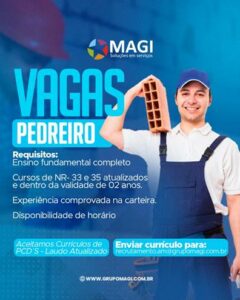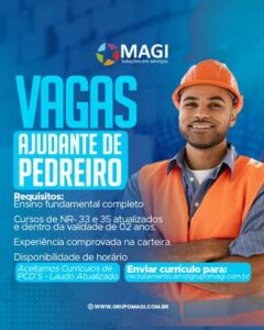 As vagas anunciadas e disponibilizadas neste site são repassadas por responsabilidade da empresa ou representante do RH. Não possuímos quaisquer vínculos com a empresa ou o anunciante. Temos o único objetivo de repassar para a população o benefício de visitar gratuitamente o nosso site, com o intuito de alcançarem o tão sonhado emprego.