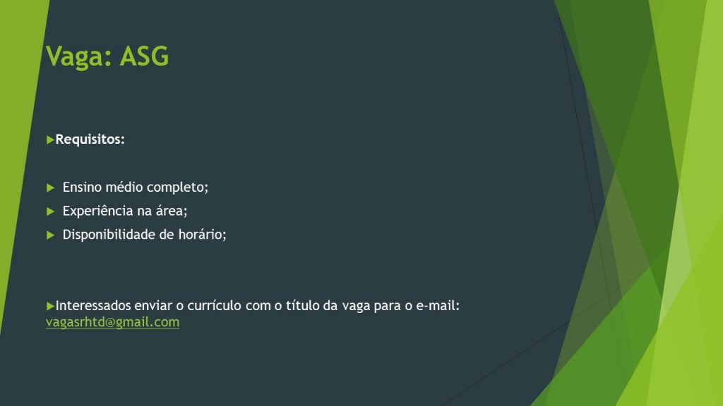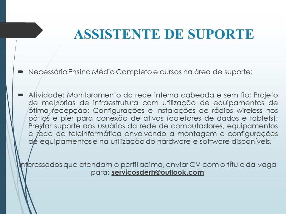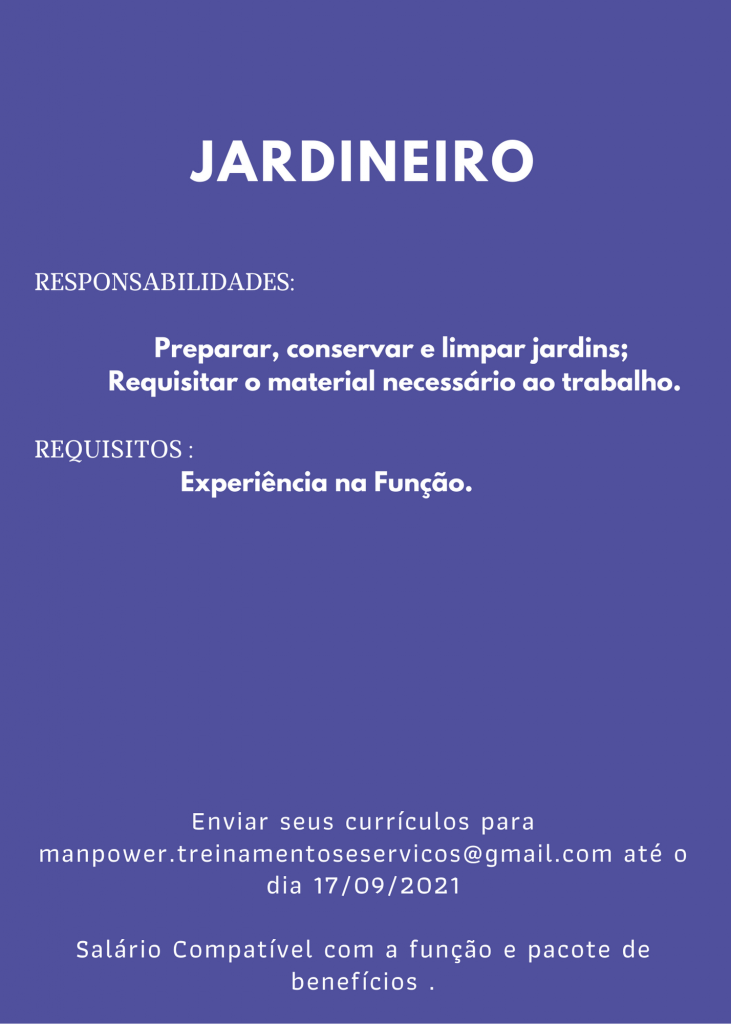 As vagas anunciadas e disponibilizadas neste site são repassadas por responsabilidade da empresa ou representante do RH. Não possuímos quaisquer vínculos com a empresa ou o anunciante. Temos o único objetivo de repassar para a população o benefício de visitar gratuitamente o nosso site, com o intuito de alcançarem o tão sonhado emprego.
