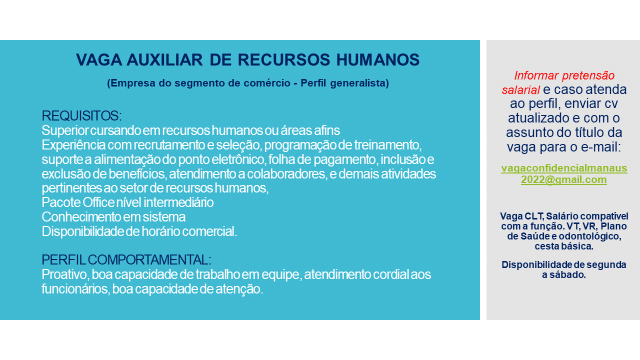 As vagas anunciadas e disponibilizadas neste site são repassadas por responsabilidade da empresa ou representante do RH. Não possuímos quaisquer vínculos com a empresa ou o anunciante. Temos o único objetivo de repassar para a população o benefício de visitar gratuitamente o nosso site, com o intuito de alcançarem o tão sonhado emprego.