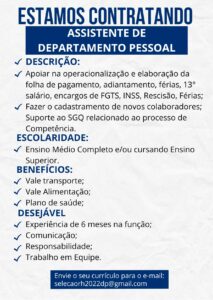 Estamos recebendo currículo para as seguintes funções: