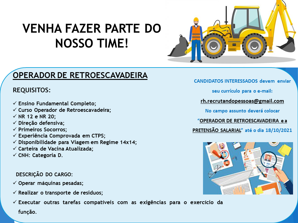 ATENÇÃO: Nunca pague nenhum valor para participar de um processo seletivo. Não compre cursos, apostilas ou serviços que prometam participação em seleção ou contratação para uma vaga. E jamais informe dados bancários, de cartão ou envie documentos por e-mail ou através de sites que não conheça.