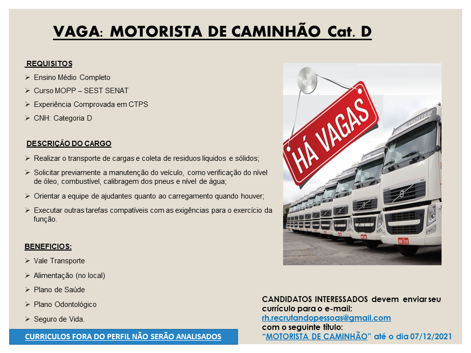 As vagas anunciadas e disponibilizadas neste site são repassadas por responsabilidade da empresa ou representante do RH. Não possuímos quaisquer vínculos com a empresa ou o anunciante. Temos o único objetivo de repassar para a população o benefício de visitar gratuitamente o nosso site, com o intuito de alcançarem o tão sonhado emprego.