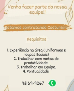 As vagas anunciadas e disponibilizadas neste site são repassadas por responsabilidade da empresa ou representante do RH. Não possuímos quaisquer vínculos com a empresa ou o anunciante. Temos o único objetivo de repassar para a população o benefício de visitar gratuitamente o nosso site, com o intuito de alcançarem o tão sonhado emprego.