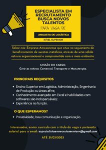 As vagas anunciadas e disponibilizadas neste site são repassadas por responsabilidade da empresa ou representante do RH. Não possuímos quaisquer vínculos com a empresa ou o anunciante. Temos o único objetivo de repassar para a população o benefício de visitar gratuitamente o nosso site, com o intuito de alcançarem o tão sonhado emprego.