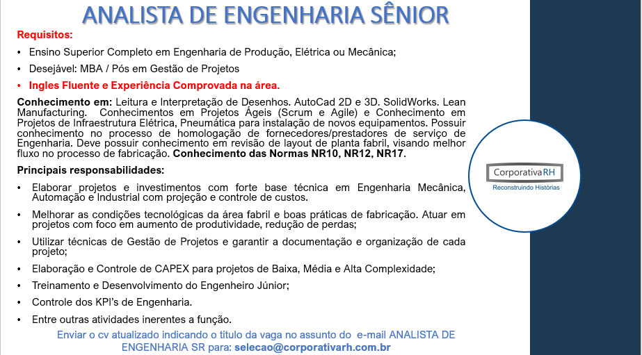 Mais informações sobre a vaga, somente por e-mail com os contratantes. Boa sorte !!!🍀
