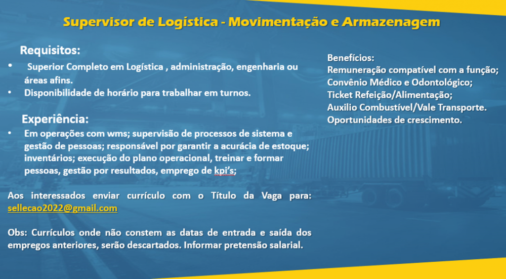 As vagas anunciadas e disponibilizadas neste site são repassadas por responsabilidade da empresa ou representante do RH. Não possuímos quaisquer vínculos com a empresa ou o anunciante. Temos o único objetivo de repassar para a população o benefício de visitar gratuitamente o nosso site, com o intuito de alcançarem o tão sonhado emprego.