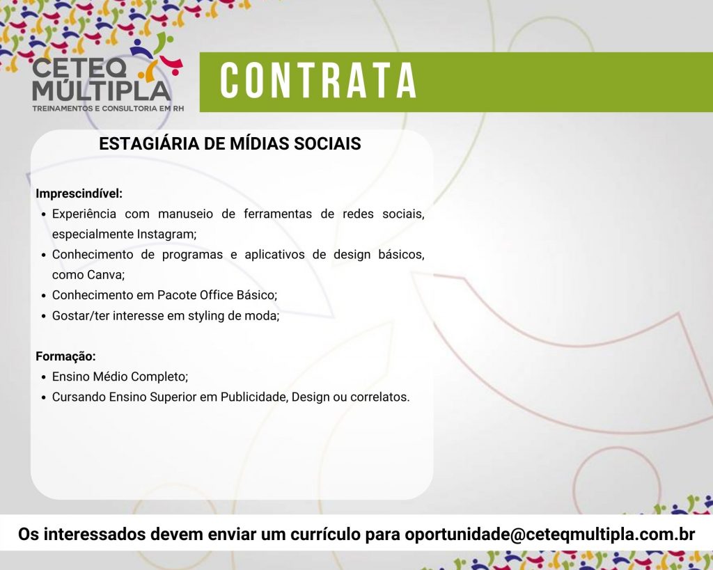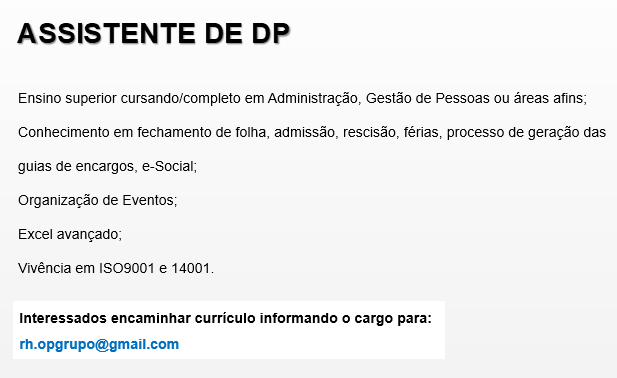 Mais informações sobre a vaga, somente por e-mail com os contratantes. Boa sorte !!!🍀