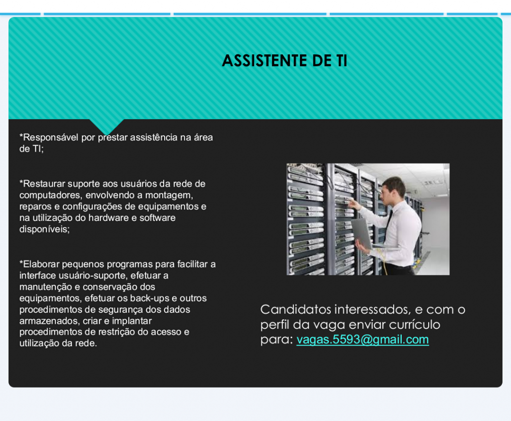 As vagas anunciadas e disponibilizadas neste site são repassadas por responsabilidade da empresa ou representante do RH. Não possuímos quaisquer vínculos com a empresa ou o anunciante. Temos o único objetivo de repassar para a população o benefício de visitar gratuitamente o nosso site, com o intuito de alcançarem o tão sonhado emprego.