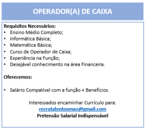 As vagas anunciadas e disponibilizadas neste site são repassadas por responsabilidade da empresa ou representante do RH. Não possuímos quaisquer vínculos com a empresa ou o anunciante. Temos o único objetivo de repassar para a população o benefício de visitar gratuitamente o nosso site, com o intuito de alcançarem o tão sonhado emprego.