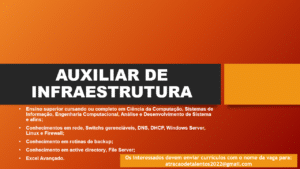 As vagas anunciadas e disponibilizadas neste site são repassadas por responsabilidade da empresa ou representante do RH. Não possuímos quaisquer vínculos com a empresa ou o anunciante. Temos o único objetivo de repassar para a população o benefício de visitar gratuitamente o nosso site, com o intuito de alcançarem o tão sonhado emprego.