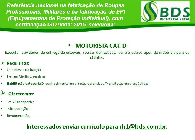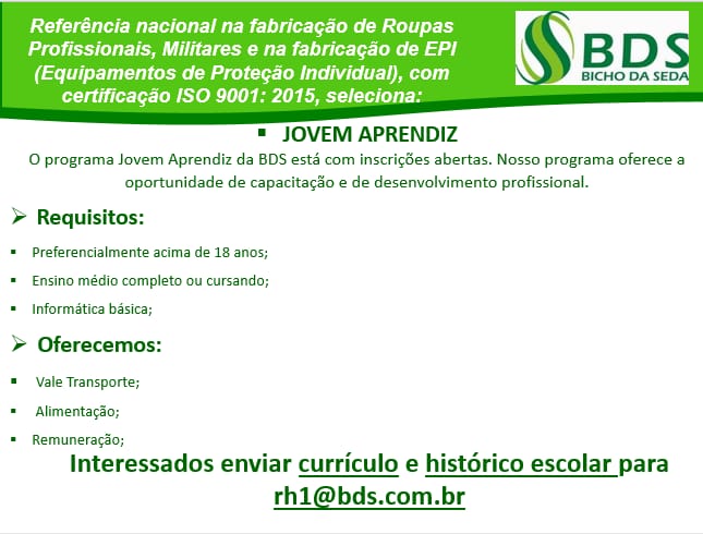 As vagas anunciadas e disponibilizadas neste site são repassadas por responsabilidade da empresa ou representante do RH. Não possuímos quaisquer vínculos com a empresa ou o anunciante. Temos o único objetivo de repassar para a população o benefício de visitar gratuitamente o nosso site, com o intuito de alcançarem o tão sonhado emprego.
