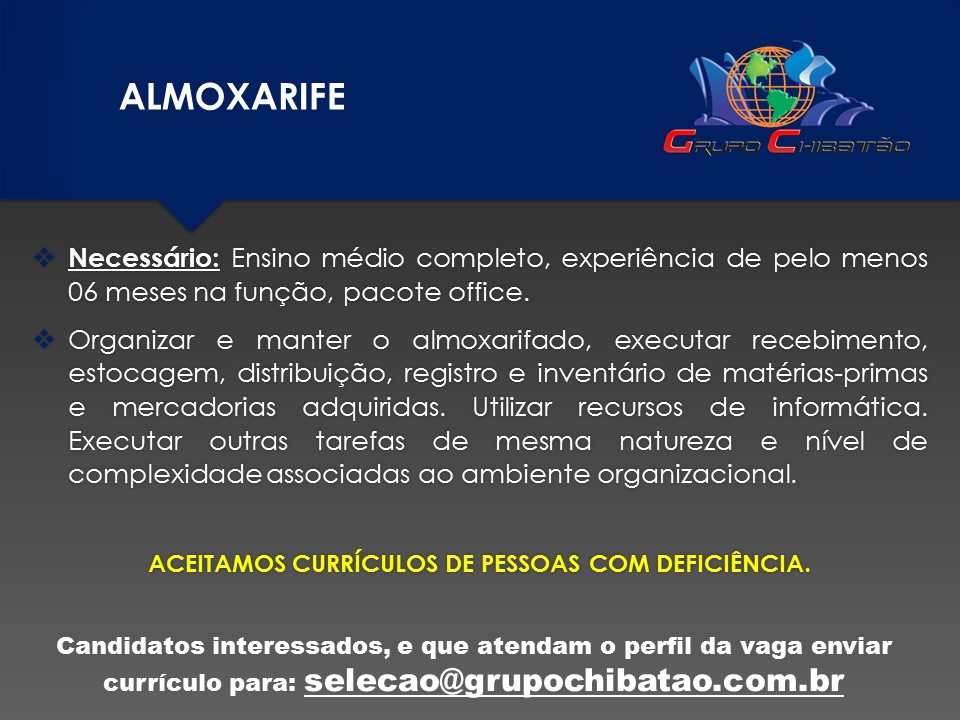 As vagas anunciadas e disponibilizadas neste site são repassadas por responsabilidade da empresa ou representante do RH. Não possuímos quaisquer vínculos com a empresa ou o anunciante. Temos o único objetivo de repassar para a população o benefício de visitar gratuitamente o nosso site, com o intuito de alcançarem o tão sonhado emprego.