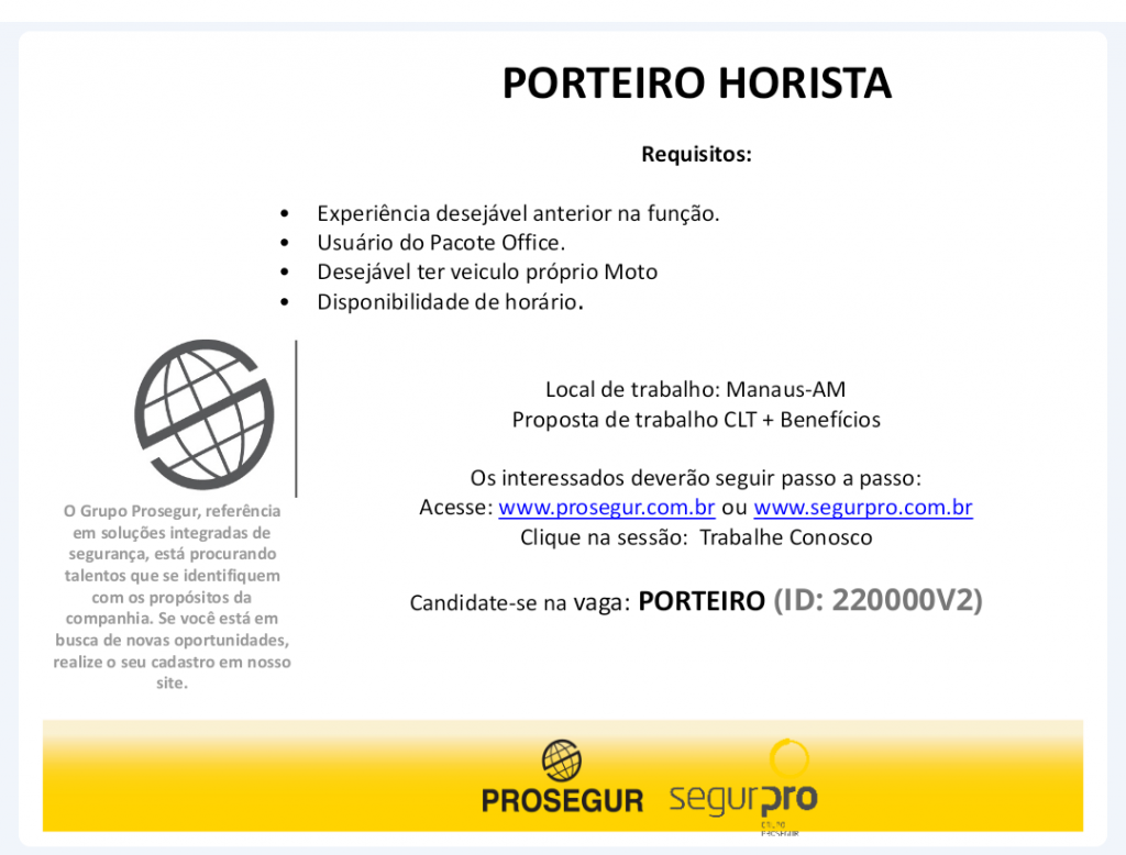 As vagas anunciadas e disponibilizadas neste site são repassadas por responsabilidade da empresa ou representante do RH. Não possuímos quaisquer vínculos com a empresa ou o anunciante. Temos o único objetivo de repassar para a população o benefício de visitar gratuitamente o nosso site, com o intuito de alcançarem o tão sonhado emprego.