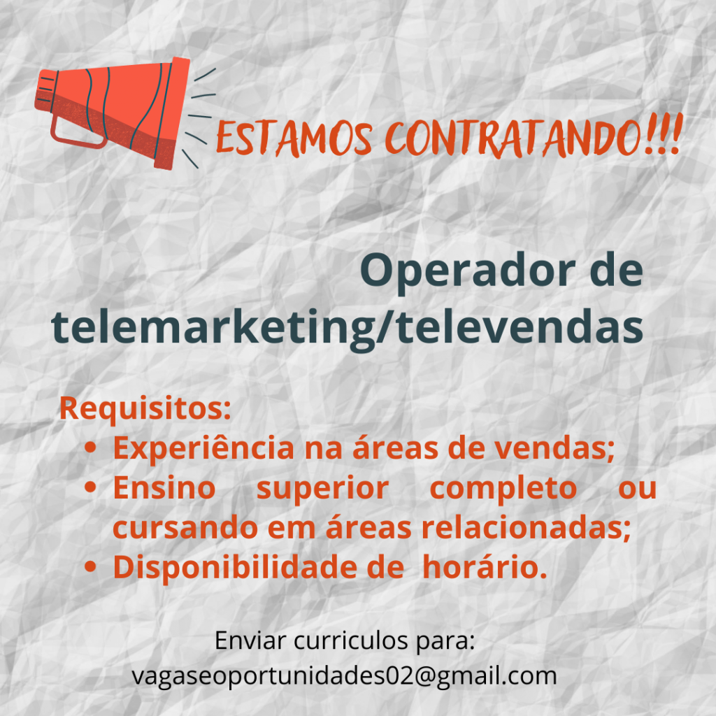 As vagas anunciadas e disponibilizadas neste site são repassadas por responsabilidade da empresa ou representante do RH. Não possuímos quaisquer vínculos com a empresa ou o anunciante. Temos o único objetivo de repassar para a população o benefício de visitar gratuitamente o nosso site, com o intuito de alcançarem o tão sonhado emprego.