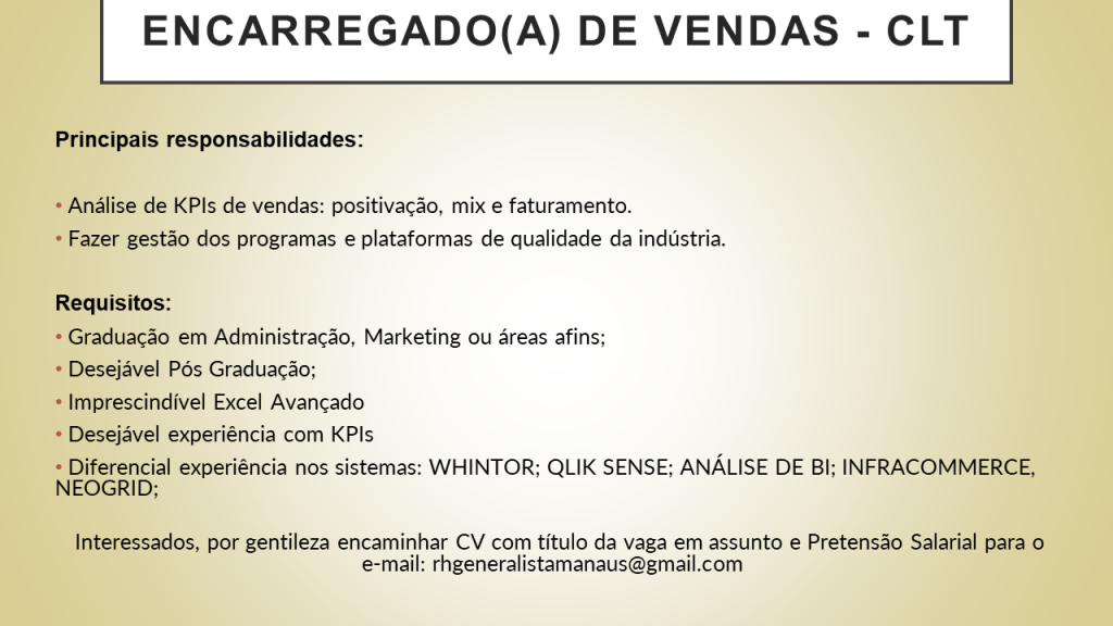 As vagas anunciadas e disponibilizadas neste site são repassadas por responsabilidade da empresa ou representante do RH. Não possuímos quaisquer vínculos com a empresa ou o anunciante. Temos o único objetivo de repassar para a população o benefício de visitar gratuitamente o nosso site, com o intuito de alcançarem o tão sonhado emprego.