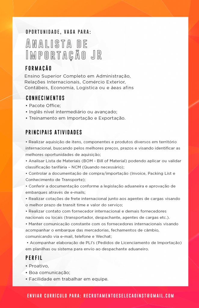Mais informações sobre a vaga, somente por e-mail com os contratantes. Boa sorte !!!🍀