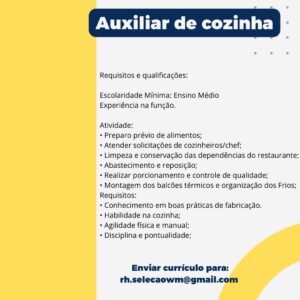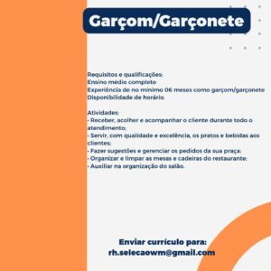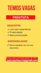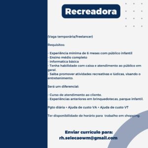 As vagas anunciadas e disponibilizadas neste site são repassadas por responsabilidade da empresa ou representante do RH. Não possuímos quaisquer vínculos com a empresa ou o anunciante. Temos o único objetivo de repassar para a população o benefício de visitar gratuitamente o nosso site, com o intuito de alcançarem o tão sonhado emprego.