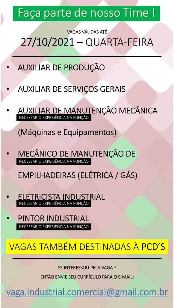 NECESSÁRIO EXPERIÊNCIA NA FUNÇÃO VAGAS TAMBÉM DESTINADAS À PCD'S SE INTERESSOU PELA VAGA ? ENTÃO ENVIE SEU CURRÍCULO PARA O E-MAIL: [email protected]