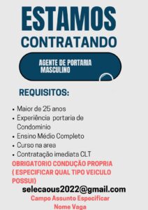 As vagas anunciadas e disponibilizadas neste site são repassadas por responsabilidade da empresa ou representante do RH. Não possuímos quaisquer vínculos com a empresa ou o anunciante. Temos o único objetivo de repassar para a população o benefício de visitar gratuitamente o nosso site, com o intuito de alcançarem o tão sonhado emprego.