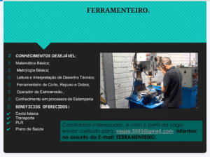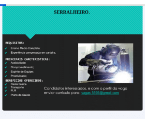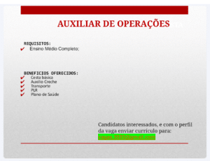 As vagas anunciadas e disponibilizadas neste site são repassadas por responsabilidade da empresa ou representante do RH. Não possuímos quaisquer vínculos com a empresa ou o anunciante. Temos o único objetivo de repassar para a população o benefício de visitar gratuitamente o nosso site, com o intuito de alcançarem o tão sonhado emprego.