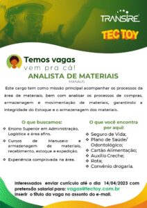 As vagas anunciadas e disponibilizadas neste site são repassadas por responsabilidade da empresa ou representante do RH. Não possuímos quaisquer vínculos com a empresa ou o anunciante. Temos o único objetivo de repassar para a população o benefício de visitar gratuitamente o nosso site, com o intuito de alcançarem o tão sonhado emprego.