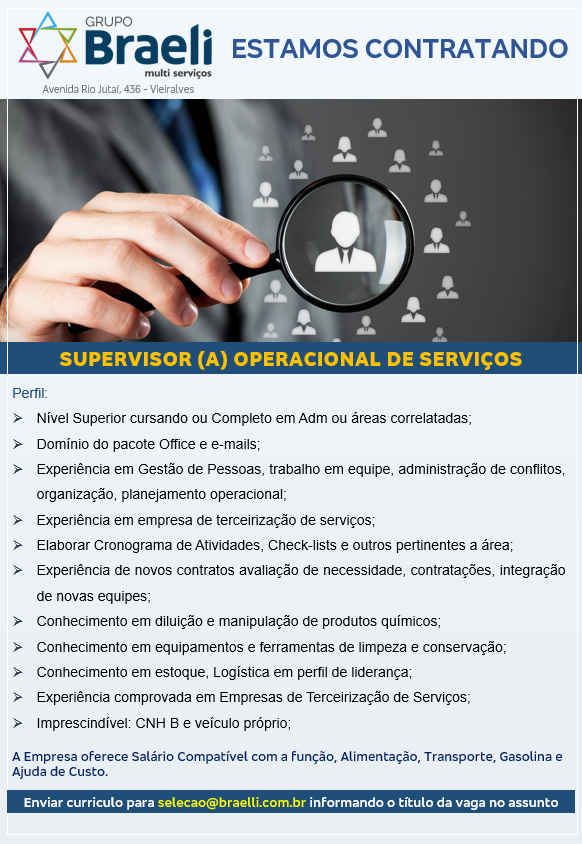 As vagas anunciadas e disponibilizadas neste site são repassadas por responsabilidade da empresa ou representante do RH. Não possuímos quaisquer vínculos com a empresa ou o anunciante. Temos o único objetivo de repassar para a população o benefício de visitar gratuitamente o nosso site, com o intuito de alcançarem o tão sonhado emprego.