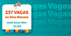 A Prefeitura de Manaus, por meio do Sine Manaus, oferta 237 vagas de emprego em várias áreas de atuação, nesta terça-feira, 21/3, de 8h às 16h. O candidato precisa validar a Carteira Digital e Previdência Social (CTPS) no aplicativo “Carteira de Trabalho Digital” ou acessar o site http://gov.br/trabalho e para concorrer às vagas, deve acessar o site http://empregabrasil.mte.gov.br para fazer a solicitação de cadastro.
