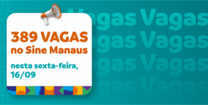 A Prefeitura de Manaus, por meio do Sine Manaus, oferta 389 vagas de emprego em várias áreas de atuação, nesta sexta-feira, 16/9, de 8h às 17h. O candidato precisa validar a Carteira Digital e Previdência Social (CTPS) no aplicativo “Carteira de Trabalho Digital” ou acessar o site http://gov.br/trabalho e para concorrer às vagas, deve acessar o site http://empregabrasil.mte.gov.br para fazer a solicitação de cadastro.