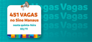 A Prefeitura de Manaus, por meio do Sine Manaus, oferta 451 vagas de emprego em várias áreas de atuação, nesta quinta-feira, 3/11, de 8h às 16h. O candidato precisa validar a Carteira Digital e Previdência Social (CTPS) no aplicativo “Carteira de Trabalho Digital” ou acessar o site http://gov.br/trabalho e para concorrer às vagas, deve acessar o site http://empregabrasil.mte.gov.br para fazer a solicitação de cadastro.
